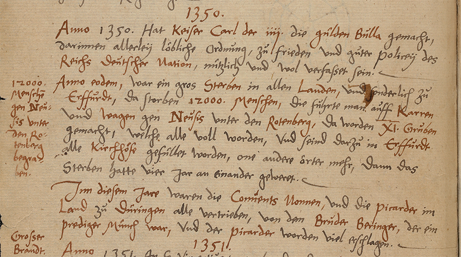 Eine spannende Handschrift ist die Erfurter Chronik CE 2° 92 (Digitalisat), welche vermutlich im letzten Drittel des 16. Jahrhunderts in Erfurt geschrieben worden ist. Laut Karl Hermanns „Bibliotheca Erfurtina“ handelt es sich wahrscheinlich um die überarbeitete Abschrift einer anderen Erfurter Stadtchronik. Sie wurde dem evangelischem Ratsgymnasium von einem ehemaligen Schüler geschenkt und gelangte später in den Bestand der Königlichen Bibliothek.