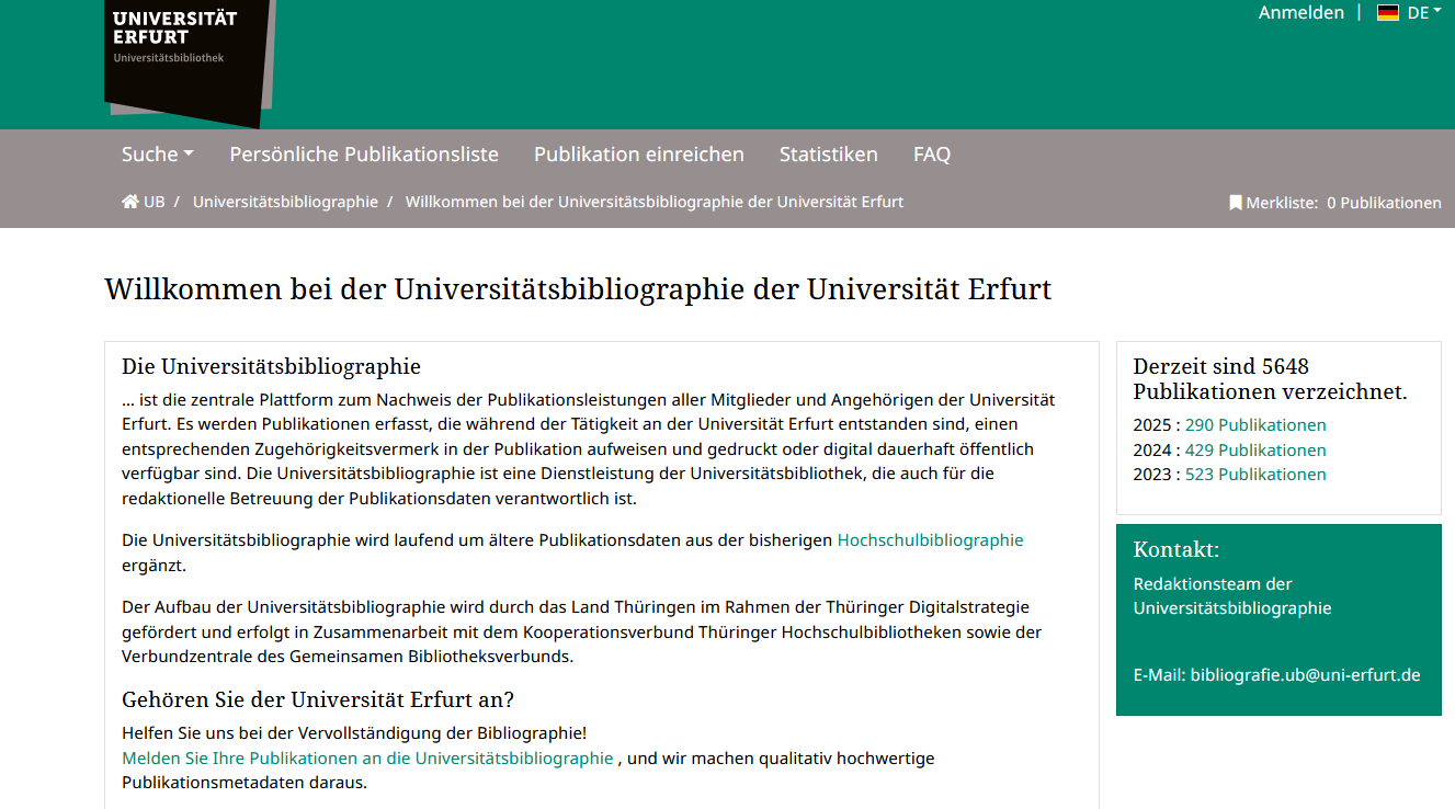 Für Anfang 2026 plant die Universitätsbibliothek, die neue Erfurter Universitätsbibliographie freizuschalten. Mit diesem ersten Blogbeitrag möchten wir grundlegende Informationen zur neuen zentralen Erfassungs- und Nachweisplattform für wissenschaftliche Publikationen der Universität Erfurt geben ‑ und natürlich wollen wir auch Neugier wecken. Die Freischaltungsphase begleiten wir durch weitere in loser Folge erscheinende Blogbeiträge. Bei Interesse lohnt es sich also ganz besonders, das „Lesezeichen“ in den nächsten Wochen und Monaten zu verfolgen.