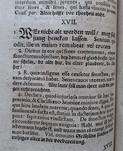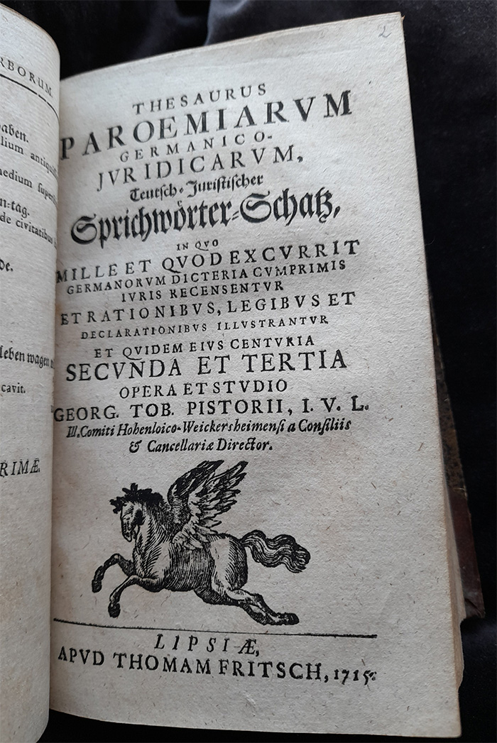 2. „ Thesavrvs Paroemiarvm Germanico-Ivridicarvm, …“ von Georg Tobias Pistorius (10-Lgp. 8° 827c (2)). Diese Sammlung juristischer deutscher Sprichwörter erschien in 6 Bänden zwischen 1715 und 1725; Pistorius war ein deutscher Jurist, Historiker und Sprichwörtersammler. Aus Band 2, der 1715 in Leipzig erschien, sehen wir das Titelblatt und einen Ausschnitt von S. 154.