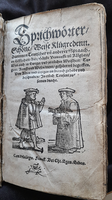 1. „Sprichwoerter Schoene Weise Klůgredenn. Darinnen Teutscher vñ anderer Spraachen Hoefflicheit Zier Hoehste Vernunfft vñ Klůgheit … begriffen …“ von Sebastian Franck, gedruckt 1555 in Frankfurt/Main (10-Lgp. 8° 828).