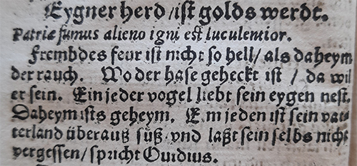 1. „Sprichwoerter Schoene Weise Klůgredenn. Darinnen Teutscher vñ anderer Spraachen Hoefflicheit Zier Hoehste Vernunfft vñ Klůgheit … begriffen …“ von Sebastian Franck, gedruckt 1555 in Frankfurt/Main (10-Lgp. 8° 828).